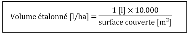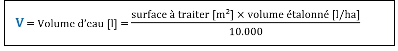 Pour traiter efficacement une surface (en mètres carrés) avec un produit autorisé à une dose donnée (en l/ha ou kg/ha ou kg/hl), l’applicateur devra mettre V litres d’eau dans la cuve du pulvérisateur avec Q litres ou kilogrammes de produit.