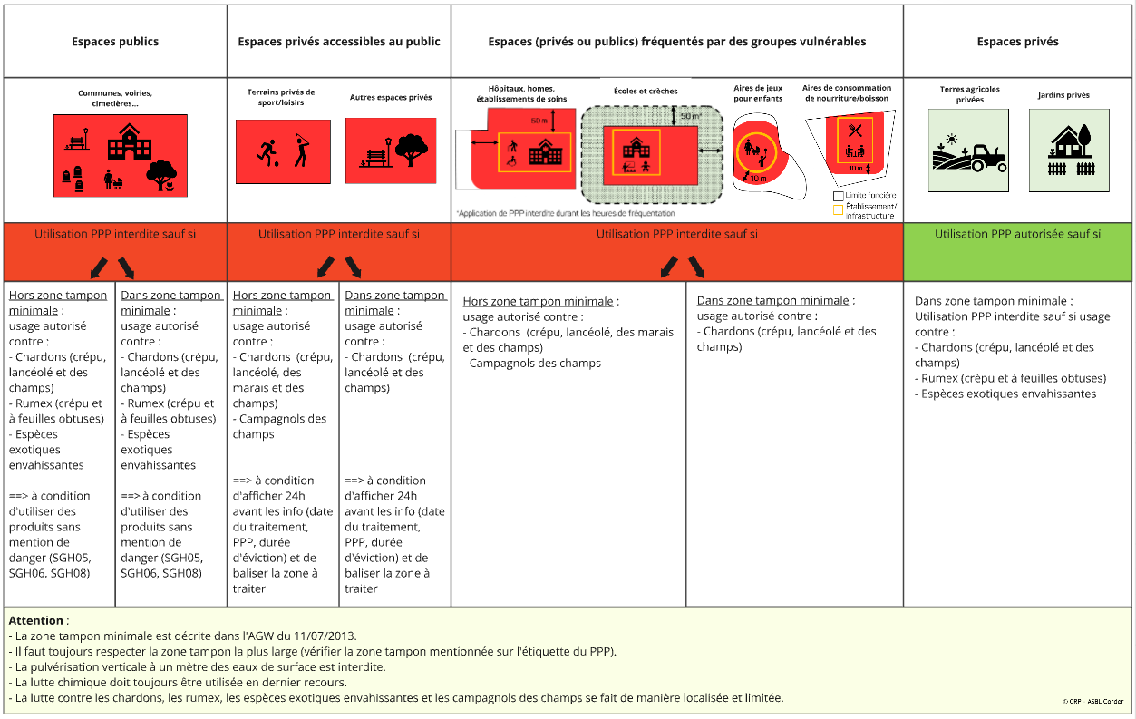 Depuis le 28 septembre 2018, l'application de PPP Produits PhytoPharmaceutiques est interdite pendant les heures de fréquentation des écoles et des crèches et ce, à moins de 50 mètres en dehors de la limite foncière de ces lieux. Plus particulièrement, les établissements concernés sont les espaces habituellement fréquentés par les élèves dans l’enceinte des établissements scolaires et des internats et espaces habituellement fréquentés par les enfants dans l’enceinte des crèches et des infrastructures d’accueil de l’enfance.