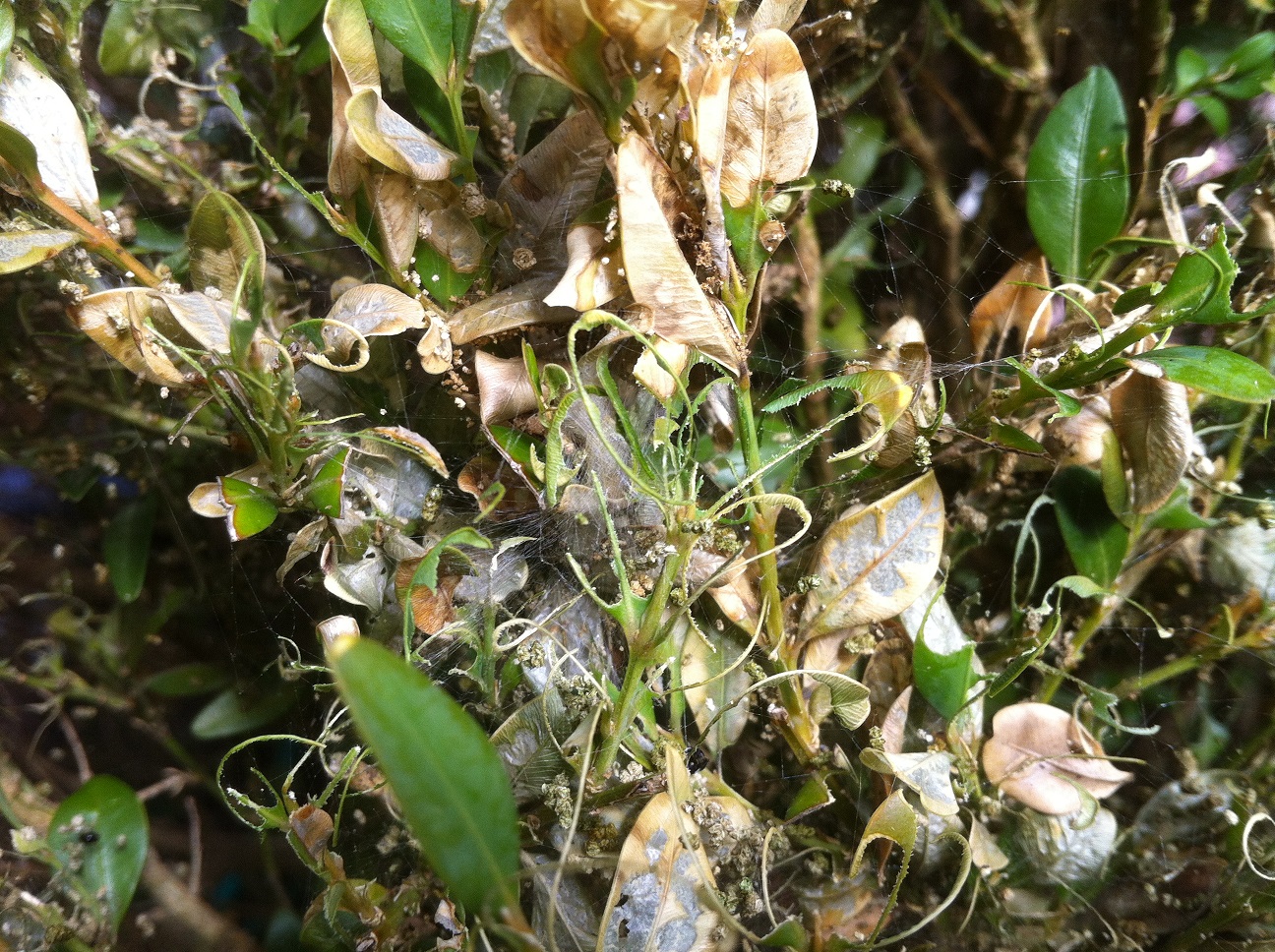 Au bout des rameaux, peuvent se trouver de jeunes chenilles (5-8 mm) issues du dernier cycle de développement, sous la forme hivernante de la pyrale. Elles se réfugient dans des logettes en soie (hibernarium) pour y passer l’hiver.