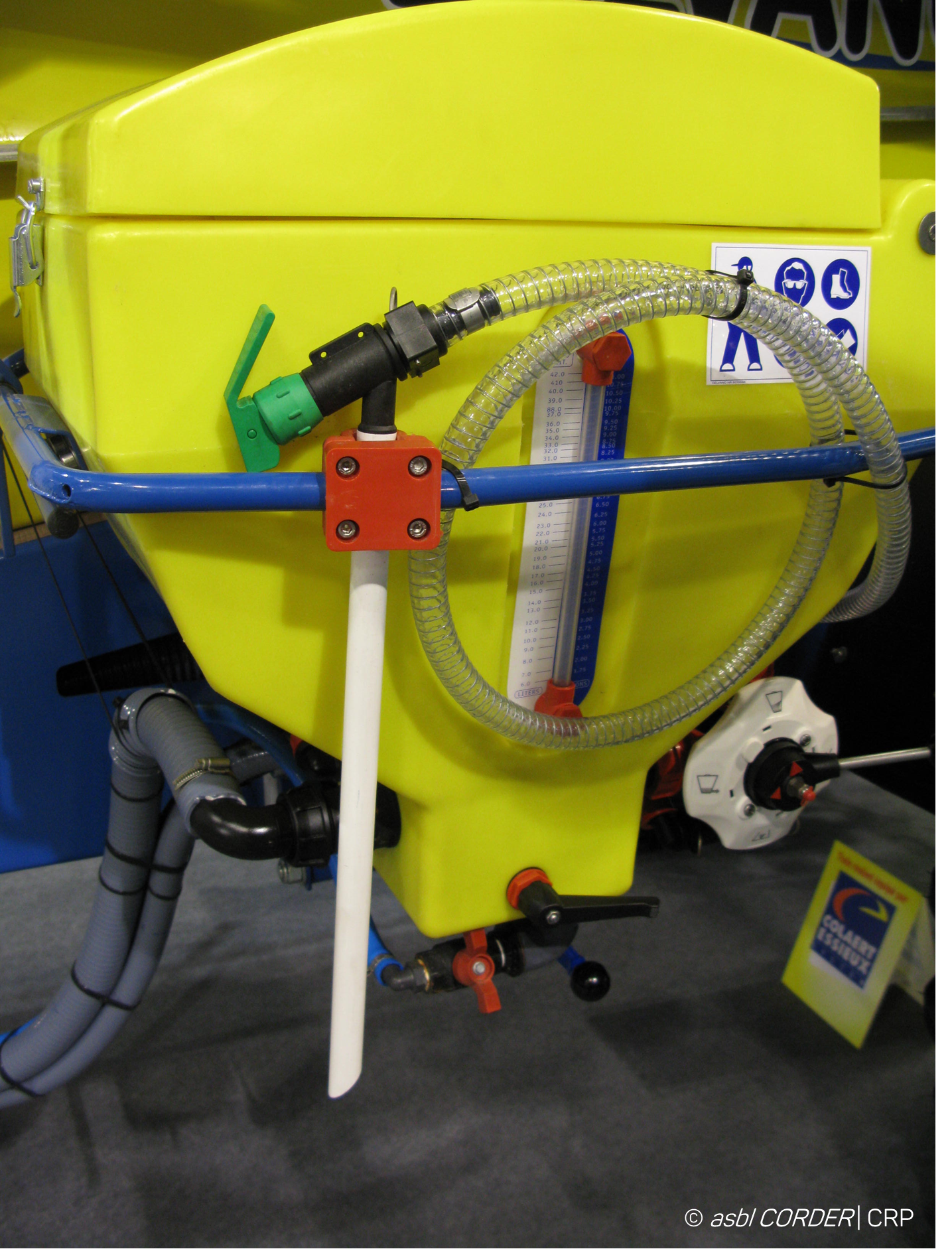 Selon que la cuve de votre pulvérisateur est munie d’une buse de rinçage interne (girolaveur ou rince-cuve) ou non, le volume de cette cuve d’eau claire est différent. La buse de rinçage interne consiste à produire un jet généralement tournant et disposé au centre de la cuve principale du pulvérisateur. Elle permet un rinçage optimal de la cuve avec une quantité d'eau réduite. Elle permet également d'éviter que des traces de produits ne contaminent la bouillie suivante ou que des dépôts ne se forment et n'obstruent les filtres et les buses. Le principal avantage réside dans le fait qu'un premier rinçage du pulvérisateur peut être effectué au champ, directement après la pulvérisation (évite dépôts, colmatage...). Si cette opération est conduite 2 ou 3 fois, le risque ultérieur de bouchage des buses est fortement limité. Lors du rinçage, il faut également rincer correctement la pompe et les conduites allant jusqu'aux buses (tuyaux, filtres…).