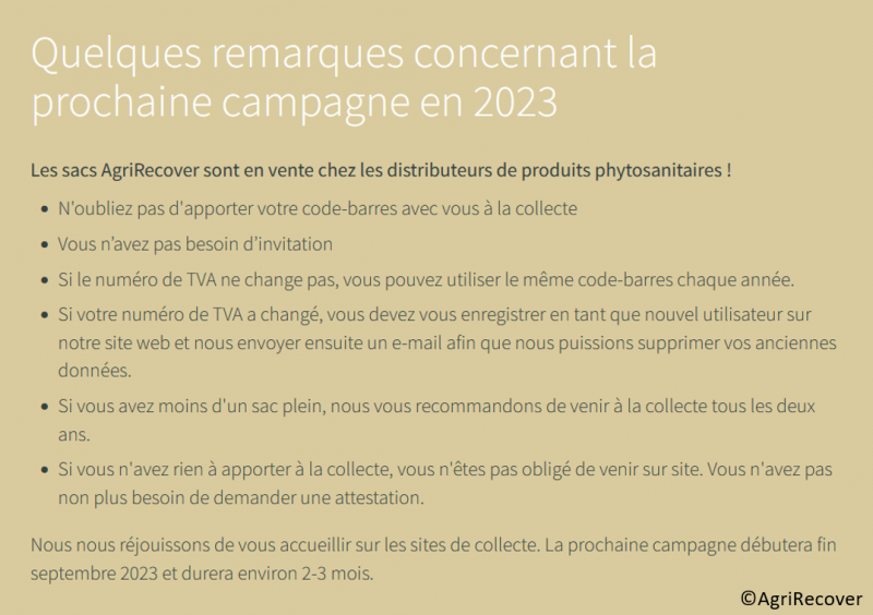 Chaque année, l’ASBL AgriRecover organise, pour les professionnels, une campagne de collecte destinée à récupérer les emballages vides de produits phytosanitaires ( PPP ), d'engrais, de biocides et de semences. Parallèlement à cette collecte annuelle, AgriRecover met en place, tous les deux ans, la reprise des produits phytopharmaceutiques non utilisables ( PPNU ).