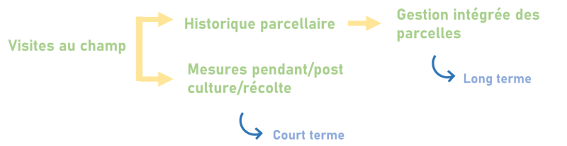 A plus court terme, les visites au champ permettent d’initier les mesures pendant la culture, pendant la récolte et après celle-ci, mais également d’éviter des mesures qui ne seraient pas utiles comme une pulvérisation en dehors des situations de risque inacceptable.
