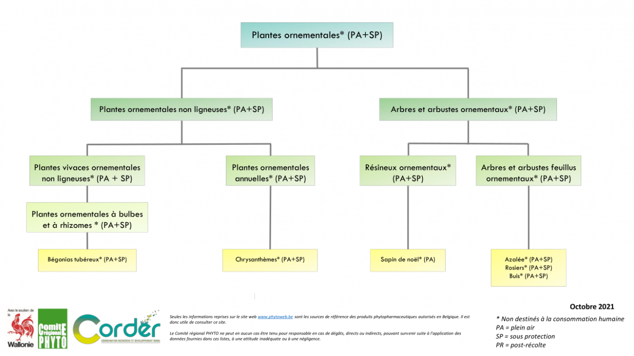 Dans le cas des plantes ornementales, une classification les regroupe en différentes catégories. Les produits utilisables sur la culture considérée sont l’ensemble des produits autorisés dans toutes les catégories auxquelles la plante ornementale appartient.