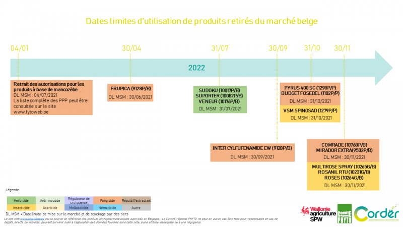 Selon les derniers communiqués de presse du SPF sur le site www.phytoweb.be, plusieurs PPP ont été ou seront prochainement retirés du marché et ne pourront plus être commercialisés ou utilisés en 2021 et 2022. Ces retraits de produits font suite au non-renouvellement de plusieurs substances actives comme le cyproconazole ou le mancozèbe. Des produits de commerce parallèle (P/P) sont également retirés du marché.