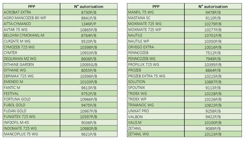 Pour les produits à base de mancozèbe, la commercialisation, la mise sur le marché et le stockage par les tiers ne seront plus autorisés à partir du 05/07/2021. Une liste complète reprenant l’ensemble des PPP concernés peut être consultée ci-dessous.