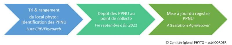 Pour se défaire correctement de ses PPNU , il y a 3 étapes à suivre : le tri/rangement de votre local phyto avec déclassement de vos PPP , le dépôt de vos PPNU et emballages vides dans un point de collecte AgriRecover durant la campagne et la mise à jour du registre des déchets dangereux.