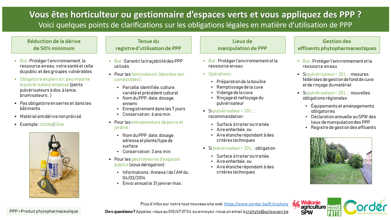 Pour les questions relatives aux équipements et aménagements obligatoires liés à la manipulation des PPP et à la gestion des effluents phytopharmaceutiques, vous pouvez contacter l’asbl PROTECT’eau au 071 68 55 53 qui est l’organisme de conseil délégué pour cette thématique.