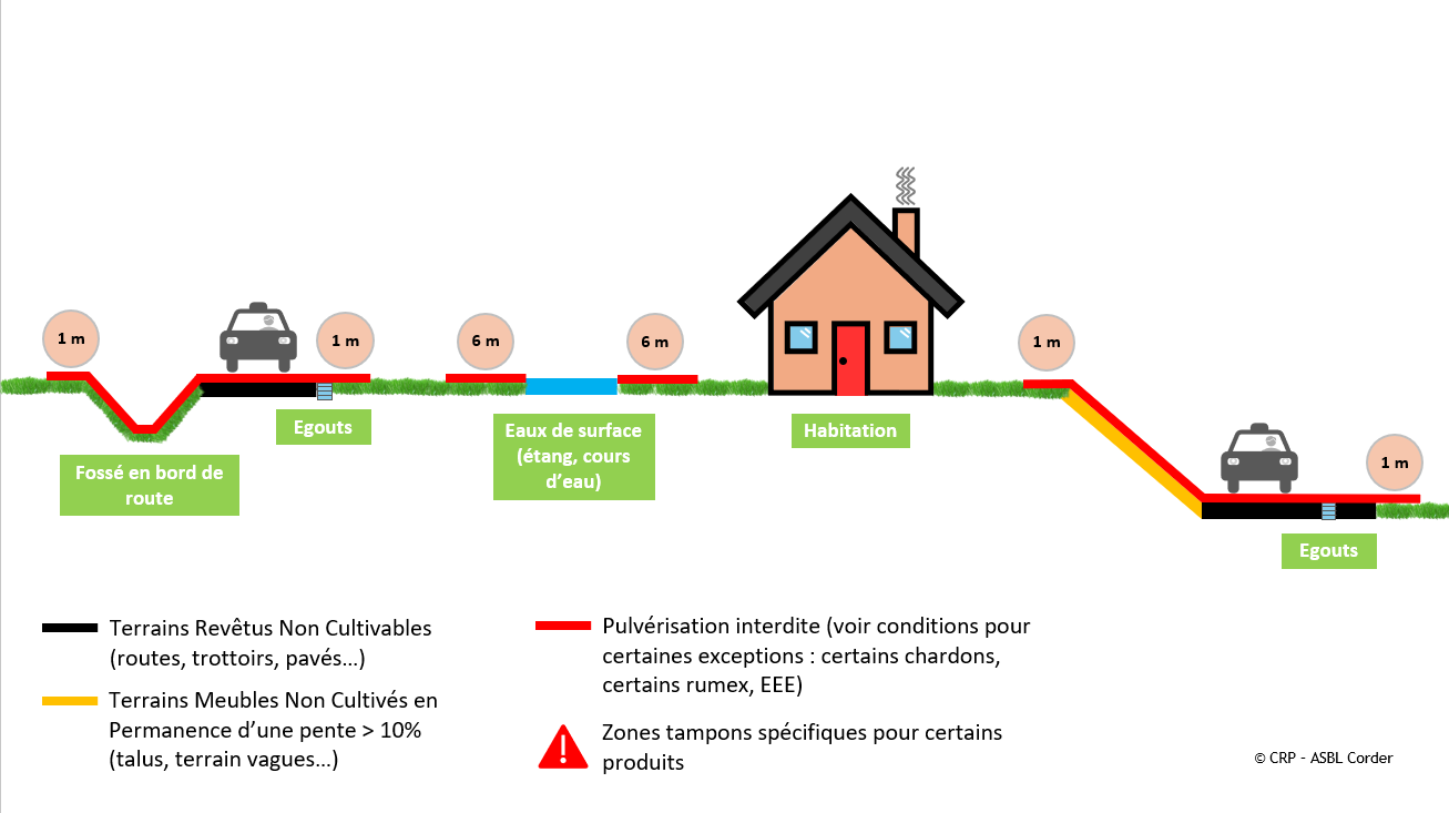 La bonne pratique agricole prévoit une zone tampon de 1 m par rapport aux surfaces ne devant pas être pulvérisées.
