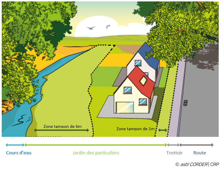 Pour chaque produit, en fonction d’une évaluation des risques, des zones tampons supplémentaires peuvent être exigées. Ces dernières sont indiquées sur l’étiquette du produit phytopharmaceutique. En Belgique, elle varie de 2 à 200 mètres selon le risque pour les organismes aquatiques, inhérent à chaque produit. Cependant, cette zone tampon peut être réduite de 50 à 90% par la mise en œuvre de techniques permettant de limiter la dérive (buses anti-dérive, système twin, haie).