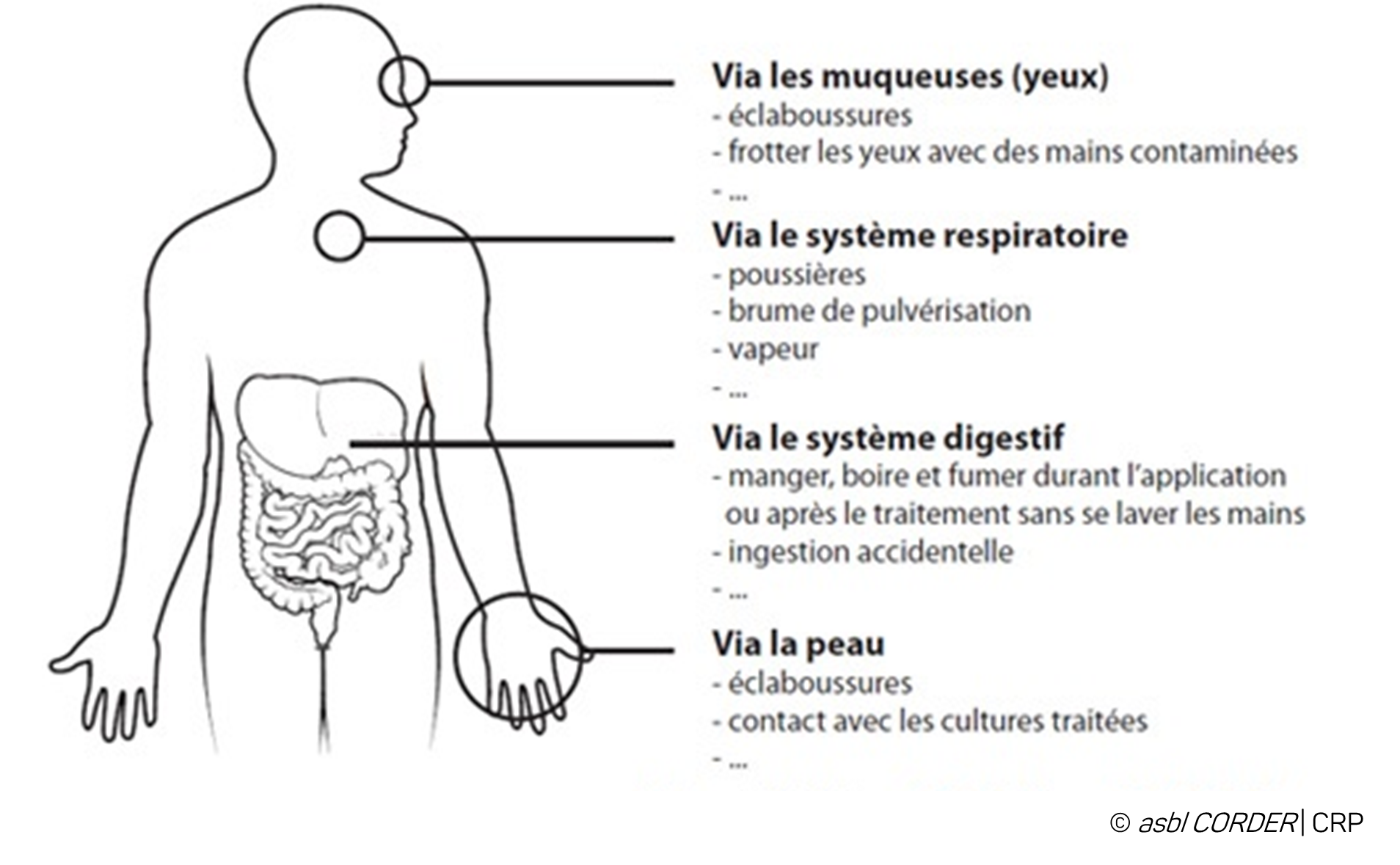 Telles que présentées dans le schéma ci-dessous, les voies d’entrées probables des PPP Produits PhytoPharmaceutiques dans le corps sont multiples. Il convient dès lors de porter les équipements de protection individuelle ( EPI Équipement de protection individuelle ) nécessaires (gants, masque…) afin de s’en protéger.