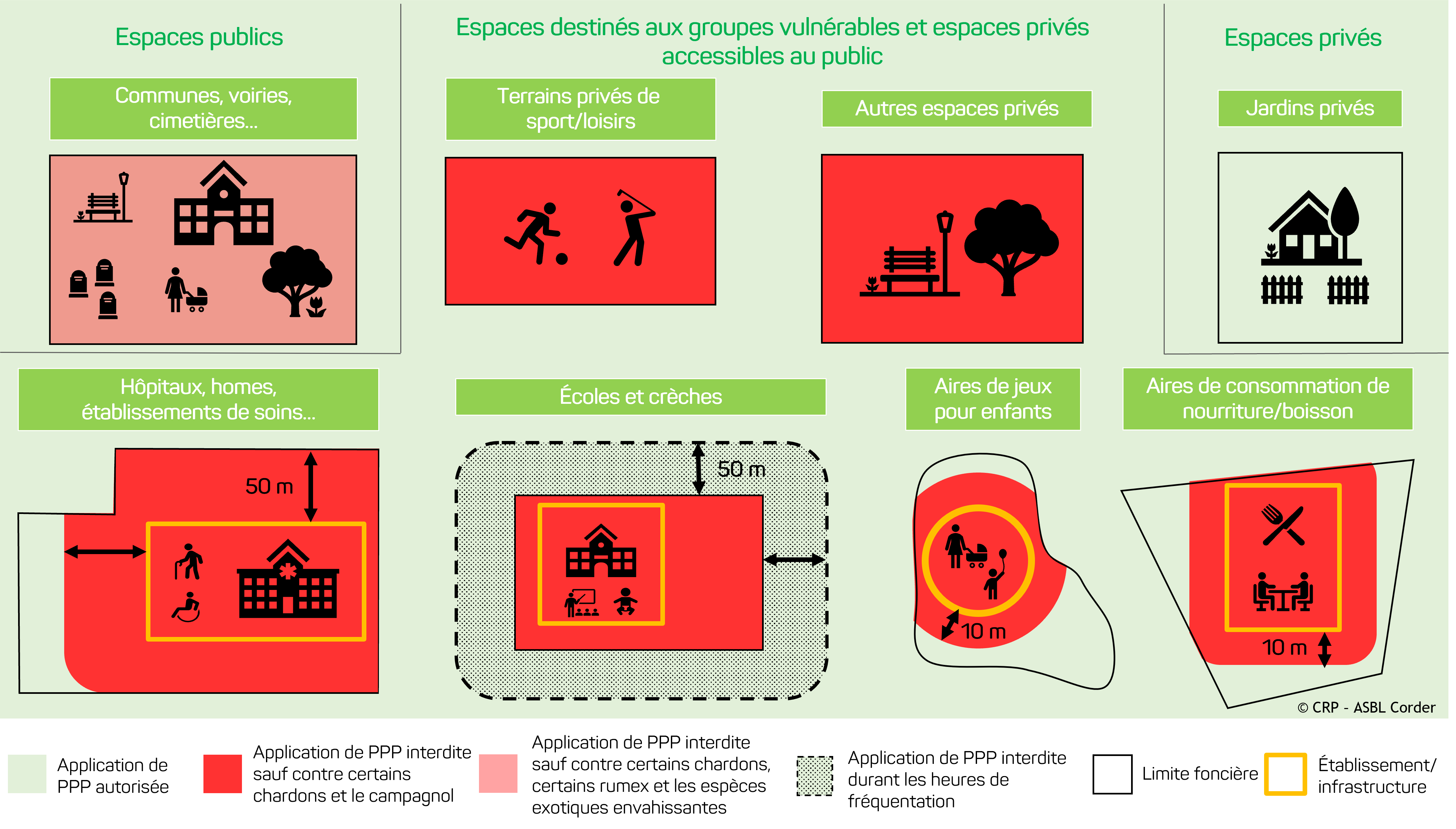 Depuis le 28 septembre 2018, l'application de PPP Produits PhytoPharmaceutiques est interdite pendant les heures de fréquentation des écoles et des crèches et ce, à moins de 50 mètres en dehors de la limite foncière de ces lieux. Plus particulièrement, les établissements concernés sont les espaces habituellement fréquentés par les élèves dans l’enceinte des établissements scolaires et des internats et espaces habituellement fréquentés par les enfants dans l’enceinte des crèches et des infrastructures d’accueil de l’enfance.