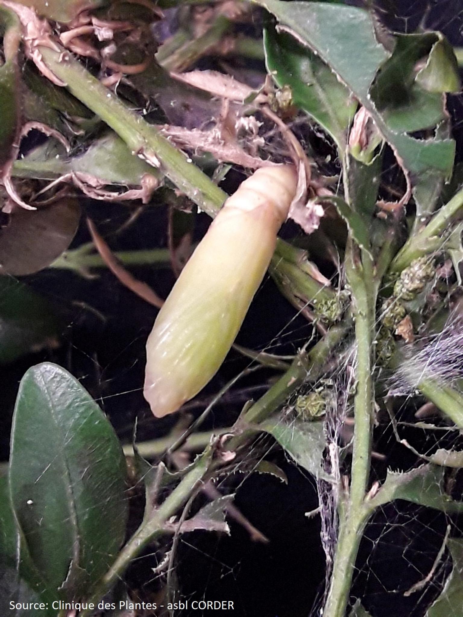 Après le stade pupe, la nymphose se produit et la chrysalide se forme pour enfin aboutir au stade papillon adulte.