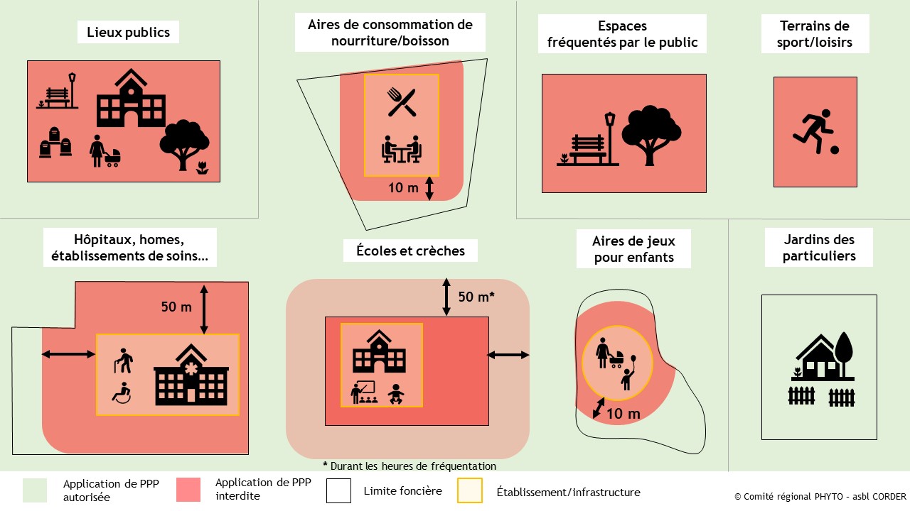 - Il est interdit de pulvériser tout PPP Produits PhytoPharmaceutiques (y compris les produits autorisés en agriculture biologique et les substances de base) à moins de 50 mètres des limites foncières d’une école ou d’un établissement accueillant des enfants, pendant les heures de fréquentation. Dans ces lieux, il est également interdit de pulvériser en tout temps.