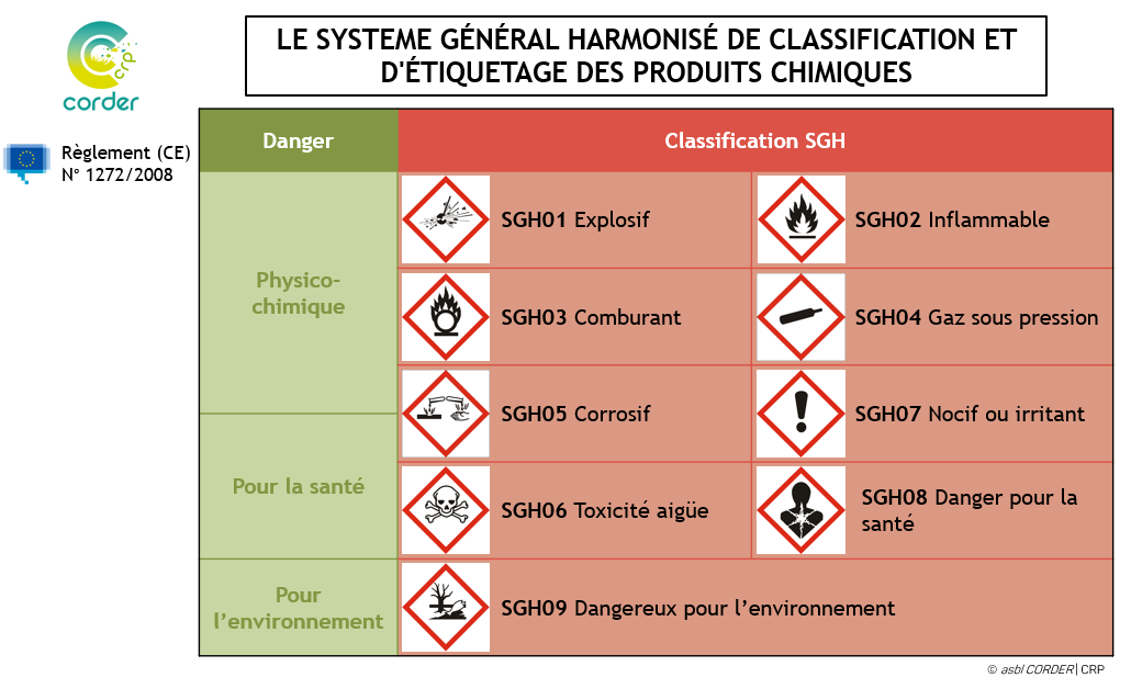 Depuis 2015, toutes les substances ainsi que les mélanges chimiques doivent respecter les dispositions et critères de classification, d’étiquetage et d’emballage basés sur le système général harmonisé ( SGH Système général harmonisé ) international des Nations Unies. Ce système classifie le danger à l’aide de pictogrammes qui ont été actualisés ainsi que de mentions d’avertissement et de danger :