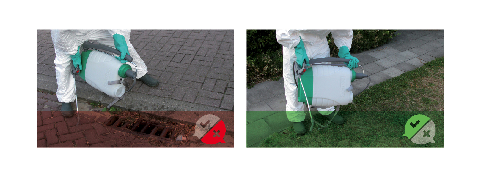 - La pulvérisation est déconseillée ou interdite sur certains endroits sensibles, même par un jardinier amateur, car elle peut entrainer une contamination des eaux de surface ou souterraines. Plus d'informations à ce sujet sont disponibles ici.