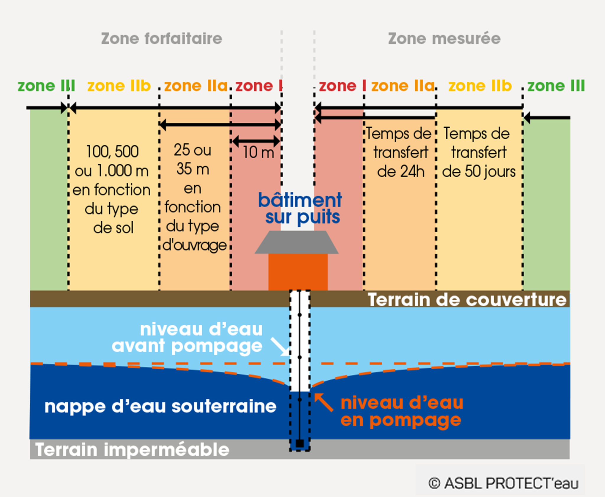 Par rapport à un captage d’eau, il existe trois zones distinctes au sein desquelles sont définies des restrictions concernant l’utilisation et le stockage de PPP Produits PhytoPharmaceutiques :