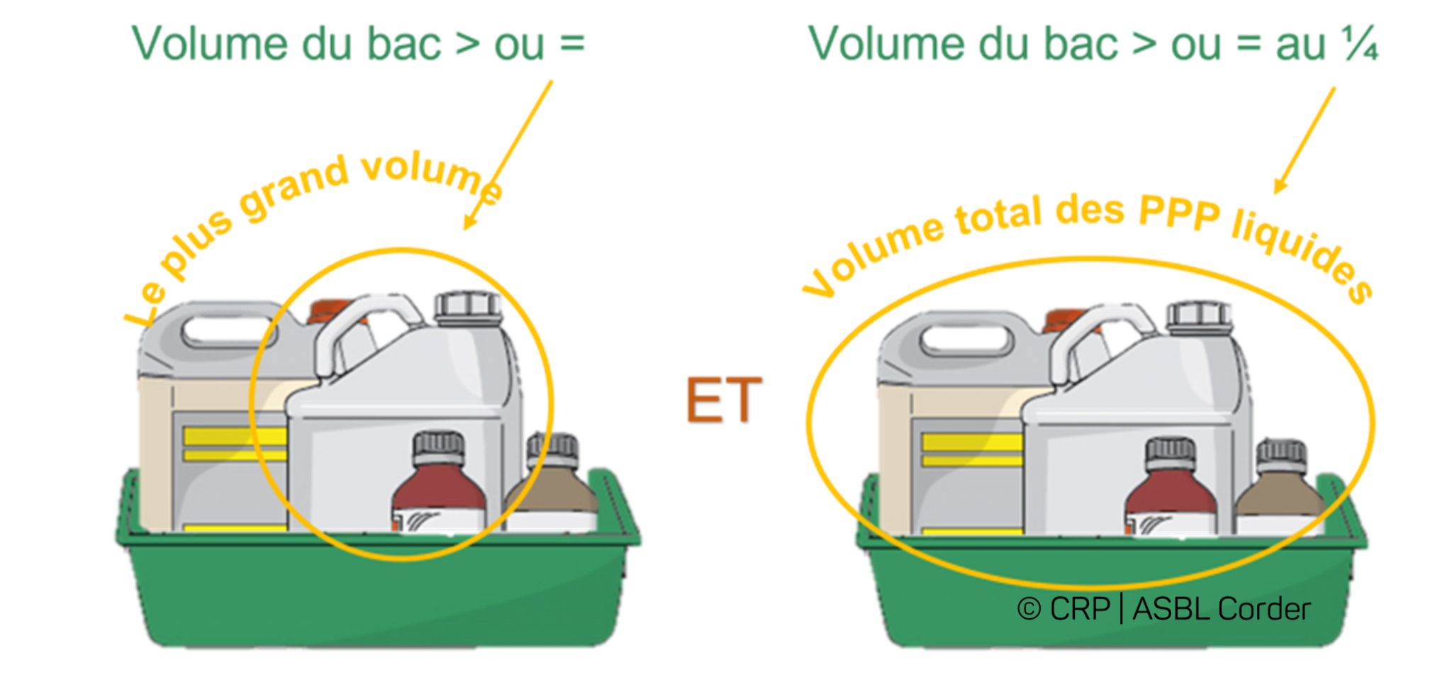 Exemple 1 : je stocke dans un bac de rétention 3 bidons de produits phyto. Un de 20L et deux de 5L, c’est-à-dire 30L au total. Le plus grand contenant est de 20L ; le quart de la quantité totale (30L) est de 7,5L. Mon bac de rétention doit prendre en compte le plus grand volume des deux et donc avoir un volume de ≥ 20L ;