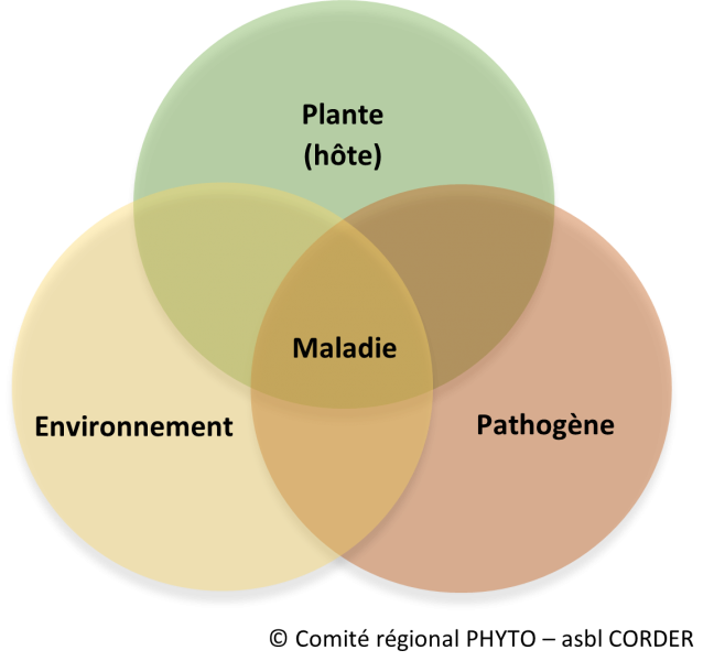 - L’environnement : les conditions environnementales (température, humidité de l’air/du sol, structure/composition du sol, repousses ou cultures avoisinantes…) peuvent être favorables ou défavorables au développement des maladies. Par exemple, un temps chaud et humide est favorable au développement des maladies fongiques.