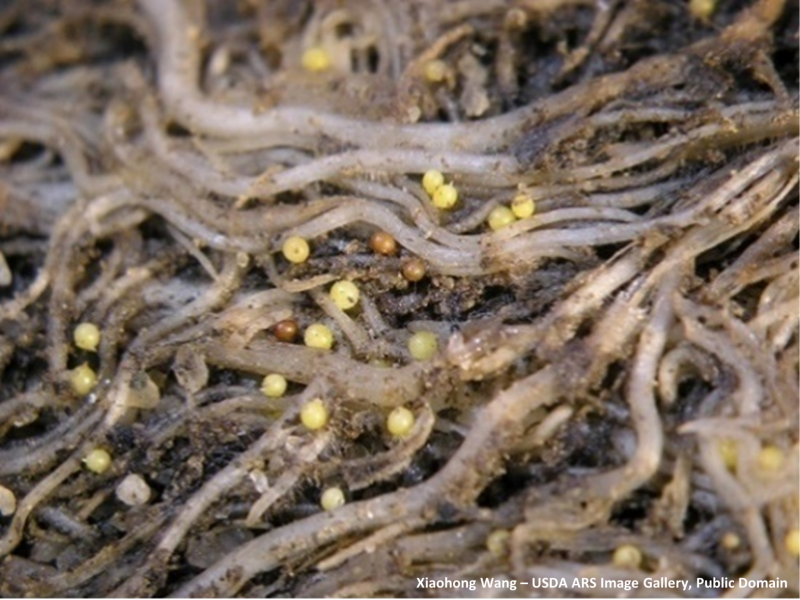 Exemple : Nématodes à kystes de la pomme de terre Parmi les symptômes visibles provoqués par les nématodes phytopathogènes, on notera la formation de kystes, d’abord blancs, puis jaune doré ou rouge-brun dans le cas du nématode à kystes en culture de pommes de terre par exemple.