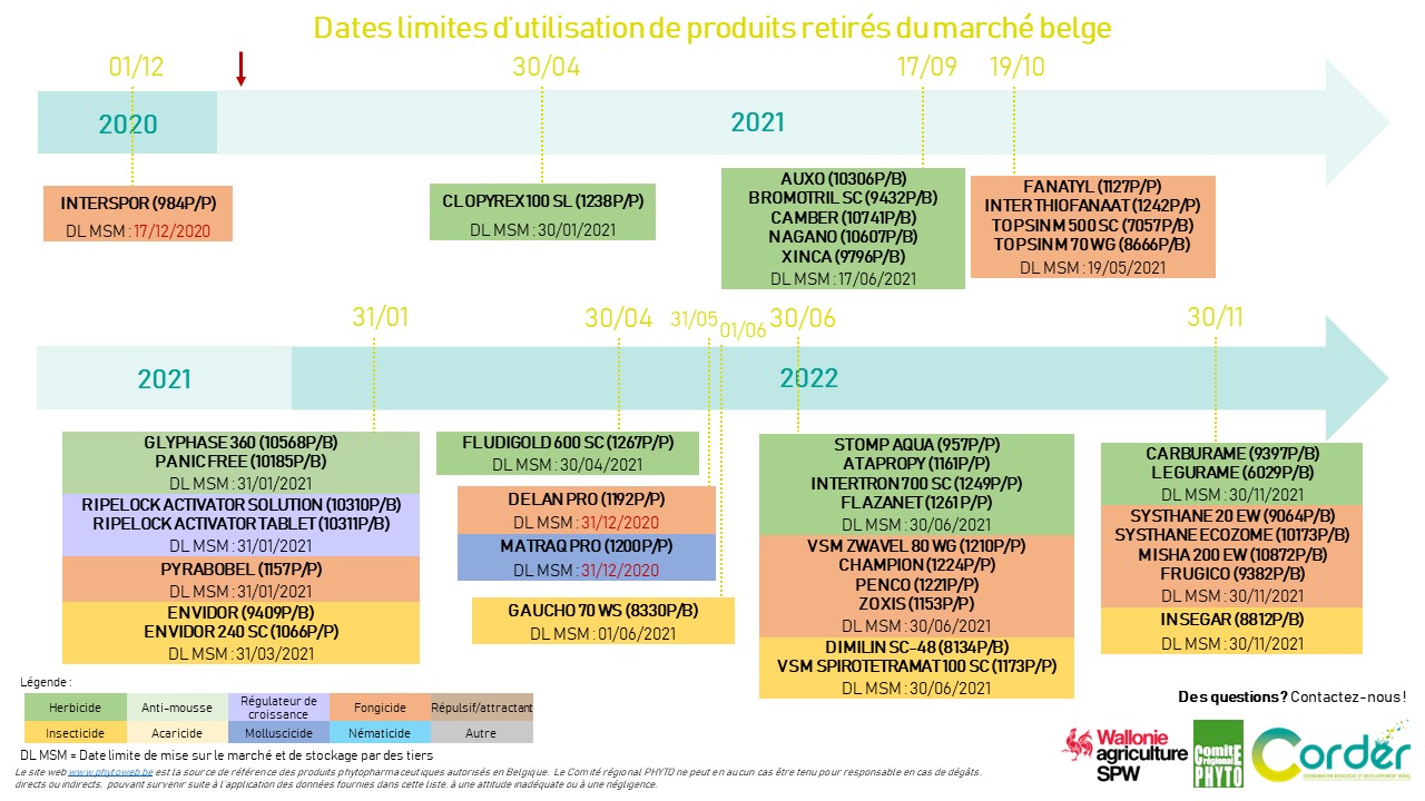 Selon les derniers communiqués de presse du SPF sur le site www.phytoweb.be, plusieurs PPP seront prochainement retirés du marché en cette nouvelle année 2021 et en 2022. Ces retraits de produits font notamment suite à l'expiration, au changement d'avis juridique ou au non-renouvellement de plusieurs substances actives comme le bromoxynil, le thiophanate-méthyle, le spirodiclofène, le carbétamide, le myclobutanil, le fénoxycarbe ou le diéthofencarbe.