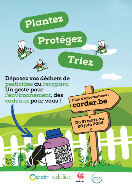 Jusqu'au 20 juin 2024, notre ASBL organise, en partenariat avec Adalia 2.0, la COPIDEC et avec le soutien de la Wallonie, une campagne de sensibilisation "Plantez, protégez, triez" qui incite les jardiniers amateurs à ramener leurs déchets de pesticides (bidons...) ou ceux dont ils se débarrassent, dans les recyparcs. Un jeu concours est organisé et chaque participant reçoit un kit de semences, et peut prétendre à gagner un lot de 200€ à dépenser dans une jardinerie labellisée "Jardiner sans pesticides".