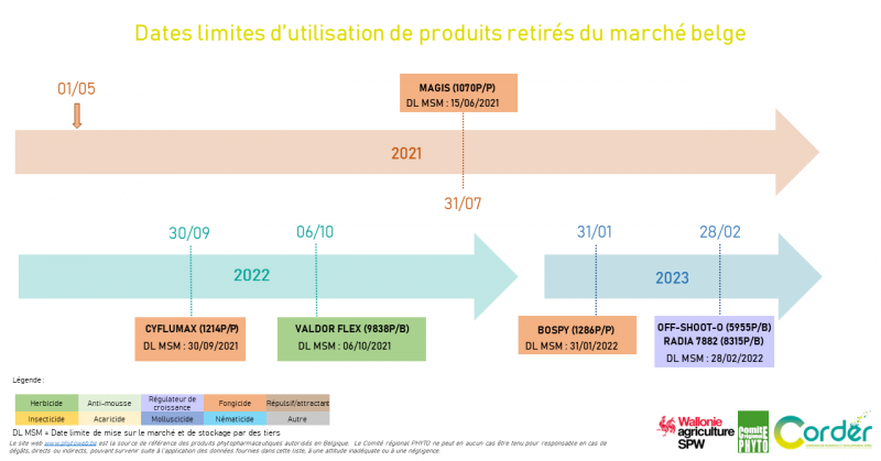 Selon les derniers communiqués de presse du  SPF  sur le site www.phytoweb.be, plusieurs  PPP  seront prochainement retirés du marché pour cette année 2021, ainsi que pour les années 2022 et 2023 à venir. Ces retraits sont principalement dû à un retrait volontaire par les détenteurs des autorisations (MAGIS, BOSPY, CYFLUMAX).