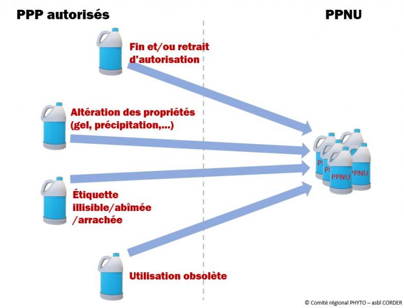 Il arrive, pour diverses raisons (voir schéma), que certains PPP ne puissent plus être utilisés. On parle alors de PPNU . Parmi eux, on trouve notamment les PPP qui ont été retirés du marché (fin et/ou retrait d’autorisation) comme les produits à base de chlorothalonil, de mancozèbe, de chlorprophame, de diquat ou d’époxiconazole.