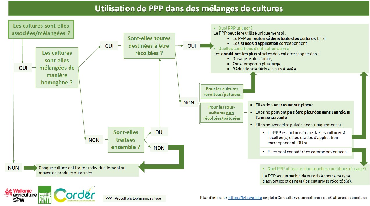 Si deux ou plusieurs cultures sont mélangées/associées et cultivées ensemble, le PPP devra, en plus d'être autorisé sur les cultures, avoir les stades d'application qui correspondent. Les conditions les plus strictes d'utilisation seront donc de vigueur.